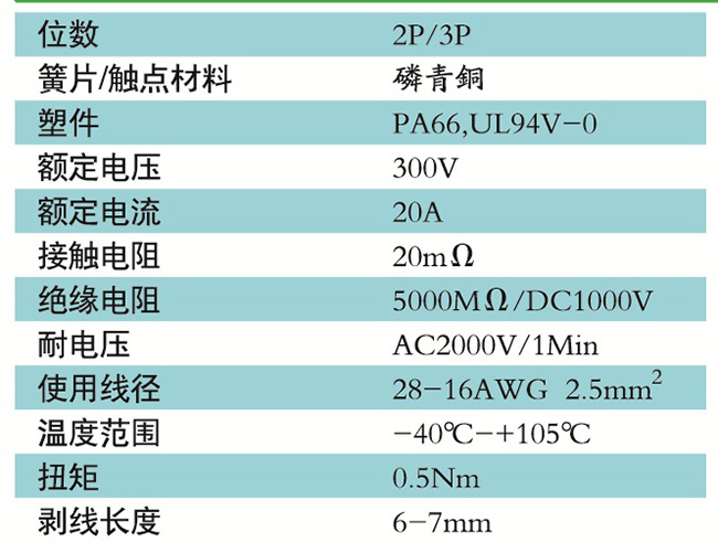接線端子的絕緣材料用改性的尼龍(PA66),能達到或超過IEC947-7-1及EN60947-7-1標準,阻燃等級達到UL94,V-0具有良好的電氣性能和機械性能。螺絲用高強度的鋼制成鍍鋅或鎳處理,導電體四方針用合金銅制成表面鍍錫,壓片采用彈性及極強的磷青銅表面鍍錫或鎳;壓線框用抗應力裂縫腐蝕的合金銅制成,這些金屬表面還鍍錫或鍍鎳加以保護。設計完全符合IEC60947-7-1.GB14048.7等標準。